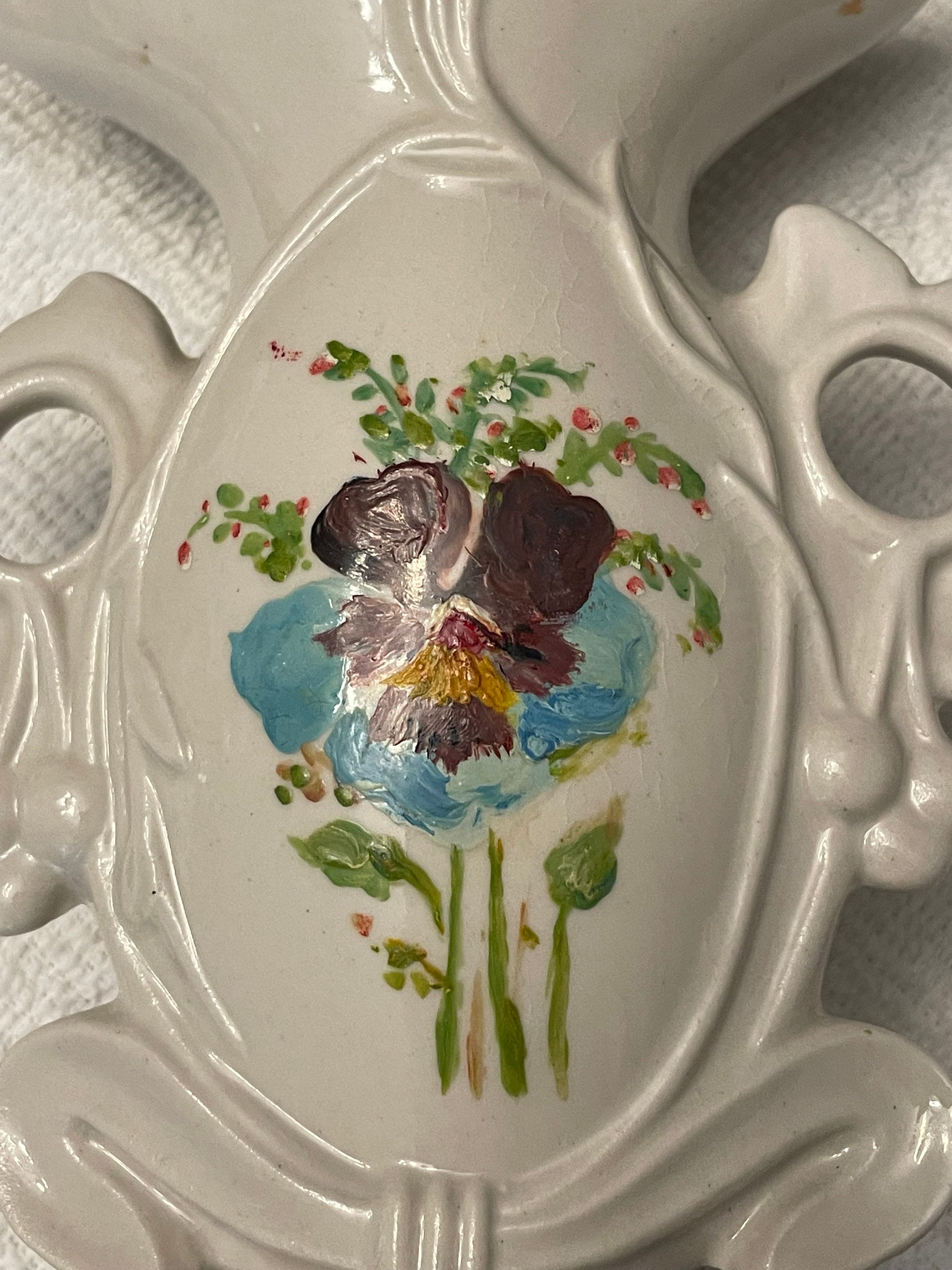 Porcelain “Wedding” vases with a hand painted floral design. Stand 6.5 inches tall. No maker markings. In good vintage condition.