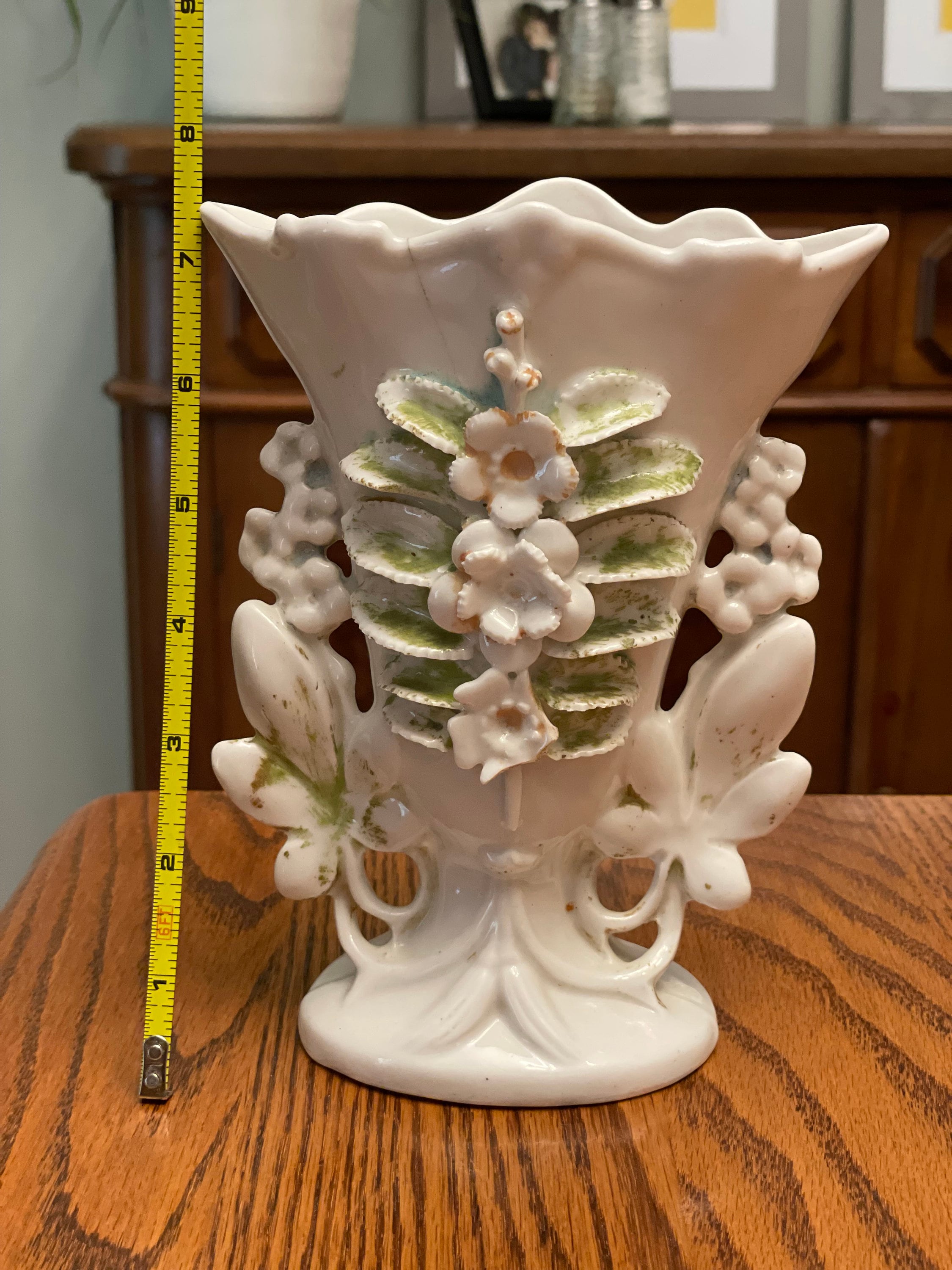 Victorian Era Spill Vase. Unique, hand painted floral design. Has one crack as seen in photo. From an estate inheritance and not much is known about the item. Made from porcelain. Measures approximately 7.5 X 5.5 inches.