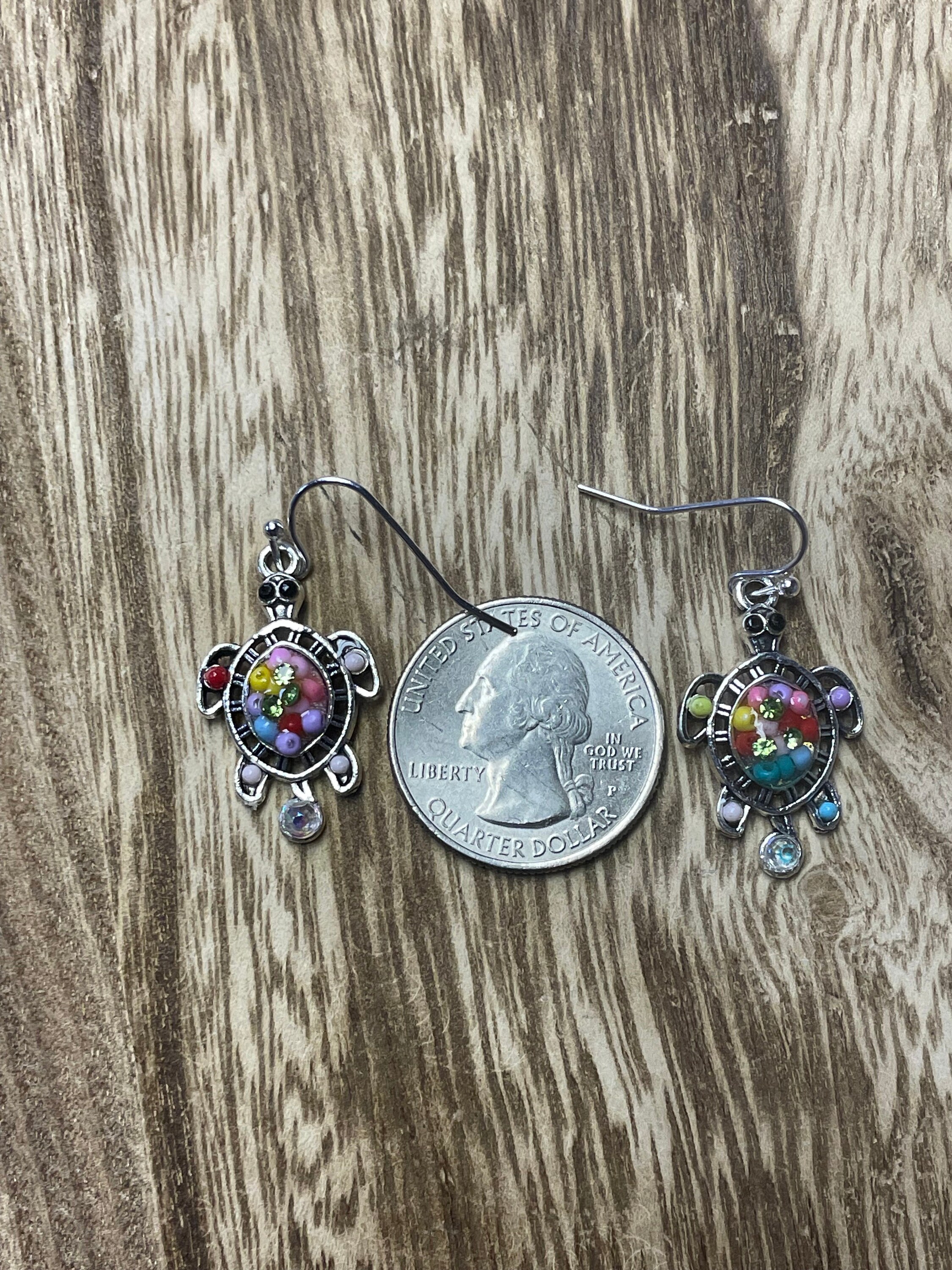 Silver Tone Dragonfly earring adorned with multi colored rhinestone accents. These charms hang from a stainless steel ear wire.