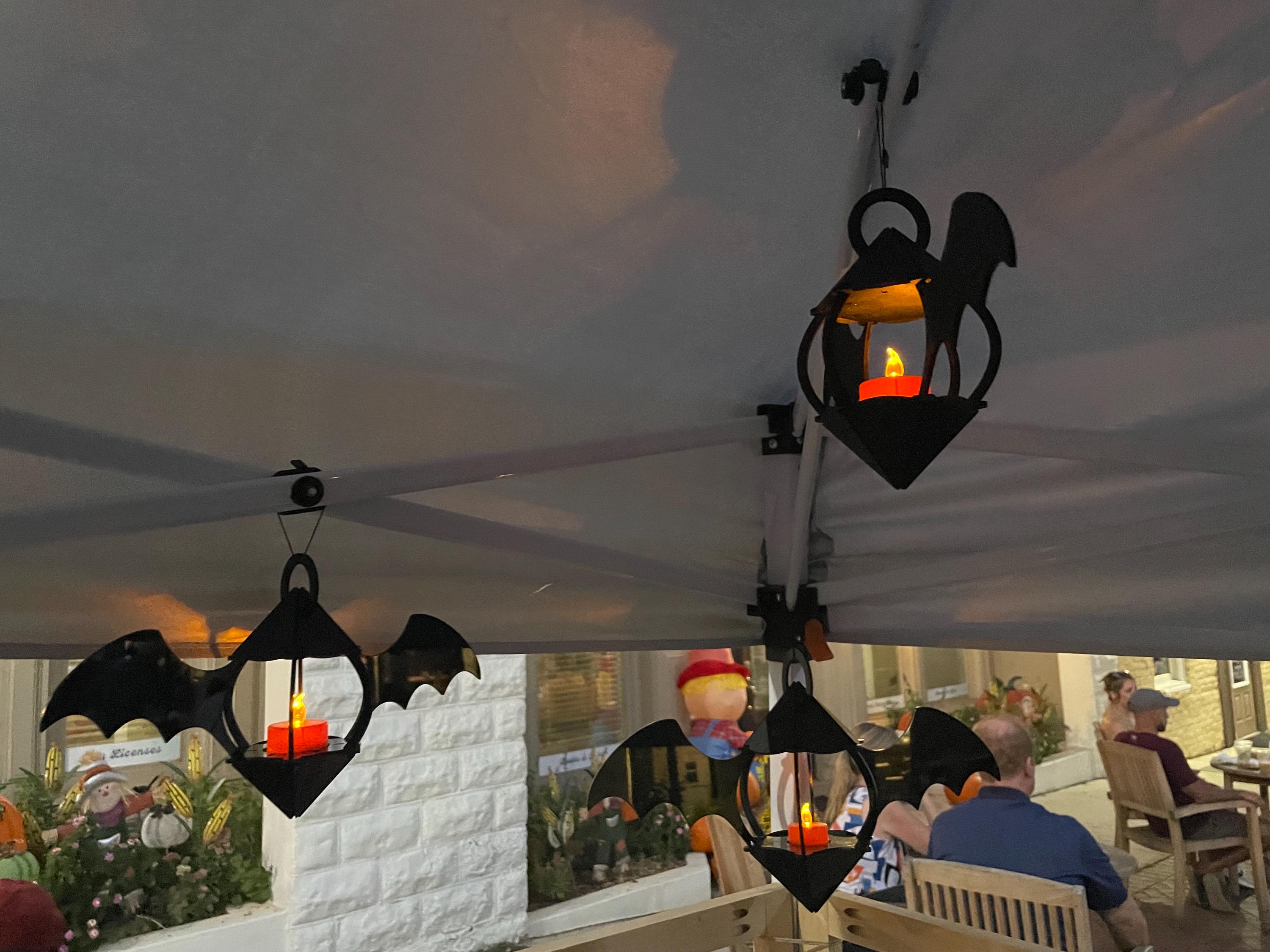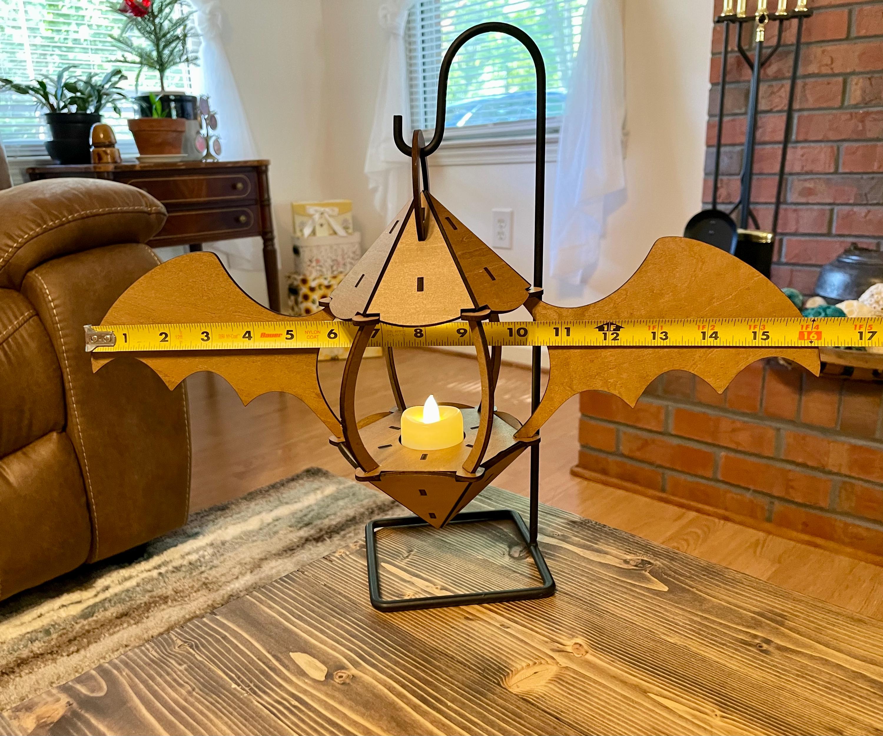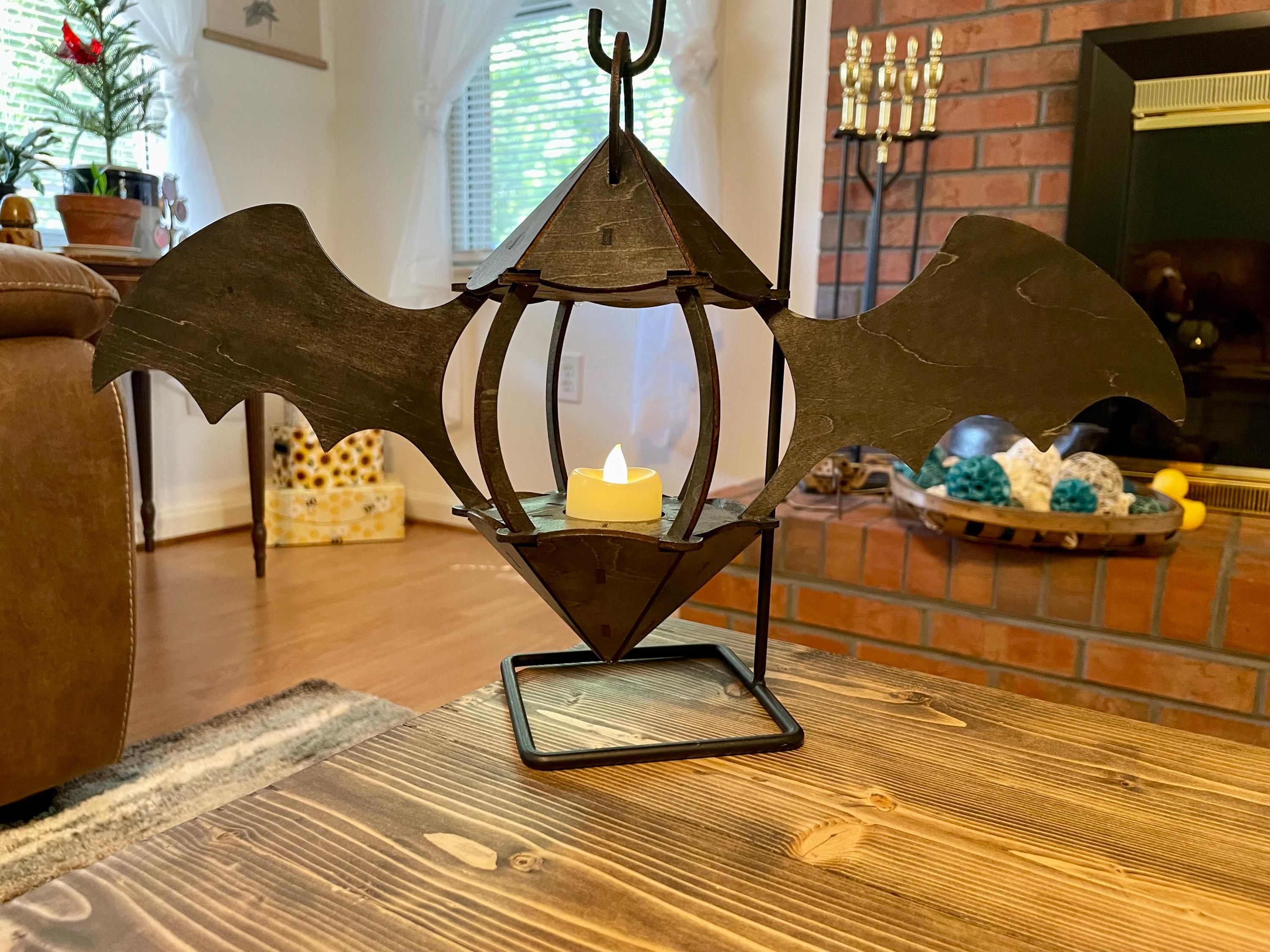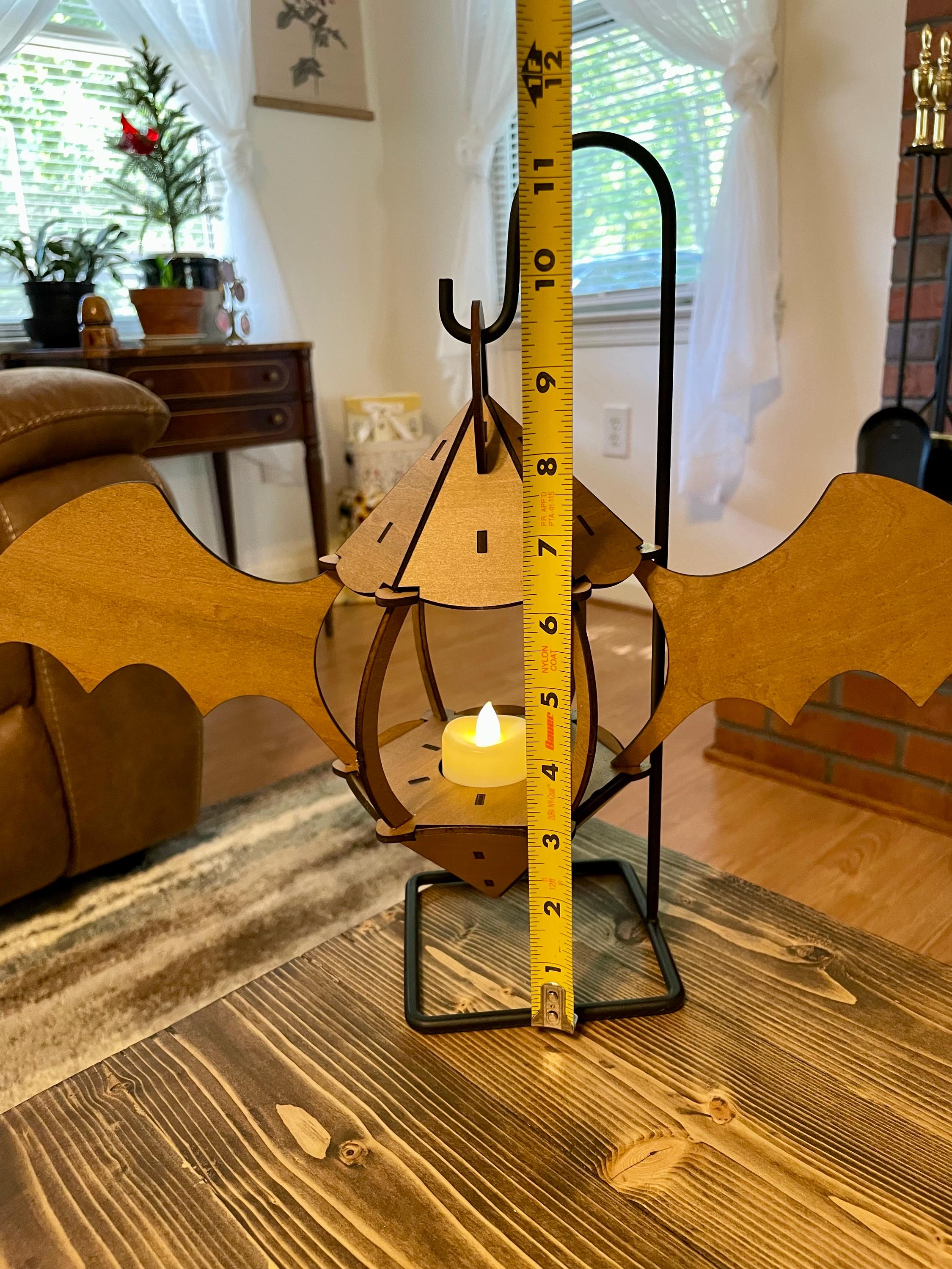 Laser cut bat shaped lantern made from bass wood. Stained in a brown or black tone. Color can be changed upon request.